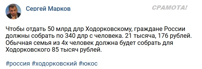 Теперь о 50 млрд. Их должны (ДОЛЖНЫ! ) вернуть не Ходорковскому, а десяткам тысяч акционеров, потерявших свои деньги по вине тех, кто распилил Юкос. В "закромах Родины" сейчас больше триллиона долларов. Достаточно и для выплат ограбленным акционерам, и для сотен тяжелобольных детей, и т.д., и т.п.. Но возьмут эти деньги, скорее всего, из наших карманов, здесь "Дубровский" и Марков вероятно правы. Но Юкос и М. Ходорковский тут ни при чём.