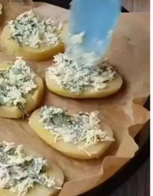 Всё это тщательно перемешиваю и выкладываю ложкой на каждый кусочек картошки по чуть-чуть.
