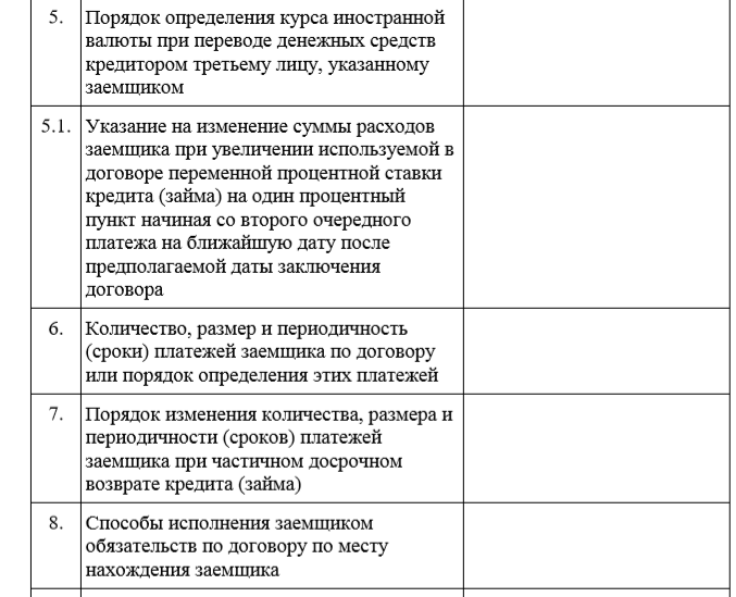 Важными считаются условия - сумма кредита, его срок, вид валюты, процентная ставка, размер ежемесячных платежей, бесплатный способ погашения и ответственность заемщика при неисполнении, а также некоторые другие условия.