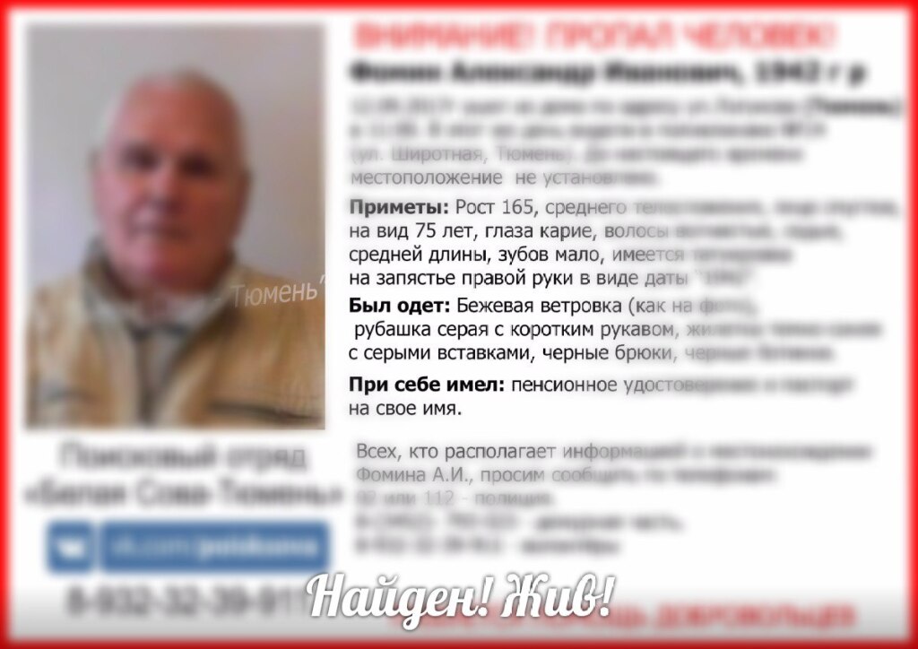 Напомним, близкие забили тревогу, когда поняли, что Сергей Трифонов вышел из дома один, перестал выходить на связь с родными и мог заблудиться. Из-за болезни Альцгеймера тюменец страдает потерей памяти. Родственники рассказали, что он может быть в Нахаловке или Зарекой. Также родные думали, что мужчина мог пойти на кладбище и заблудиться.