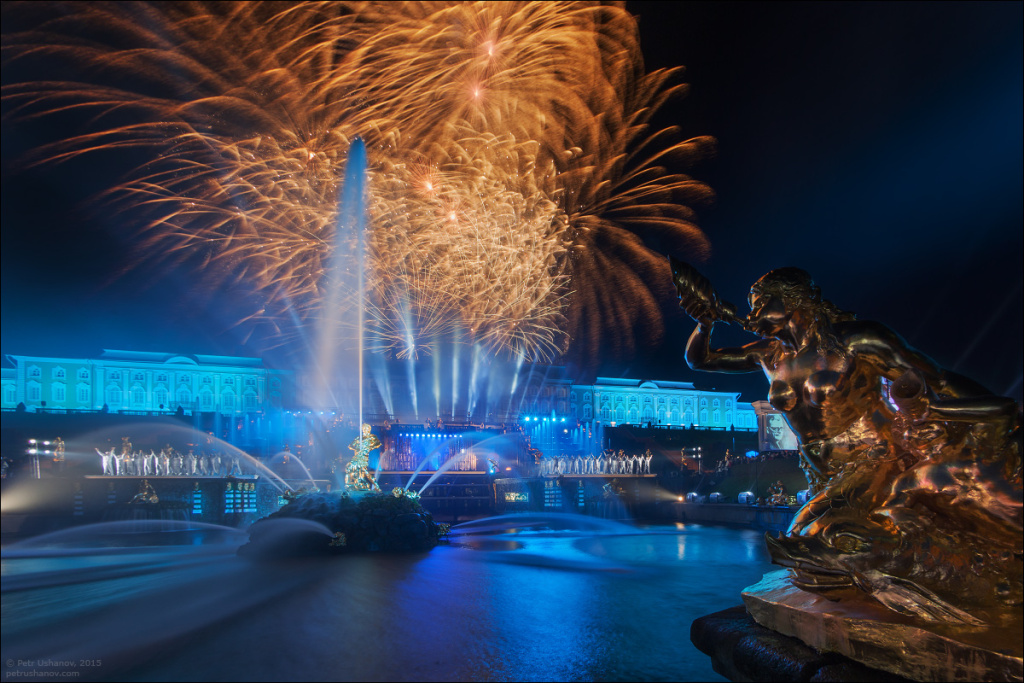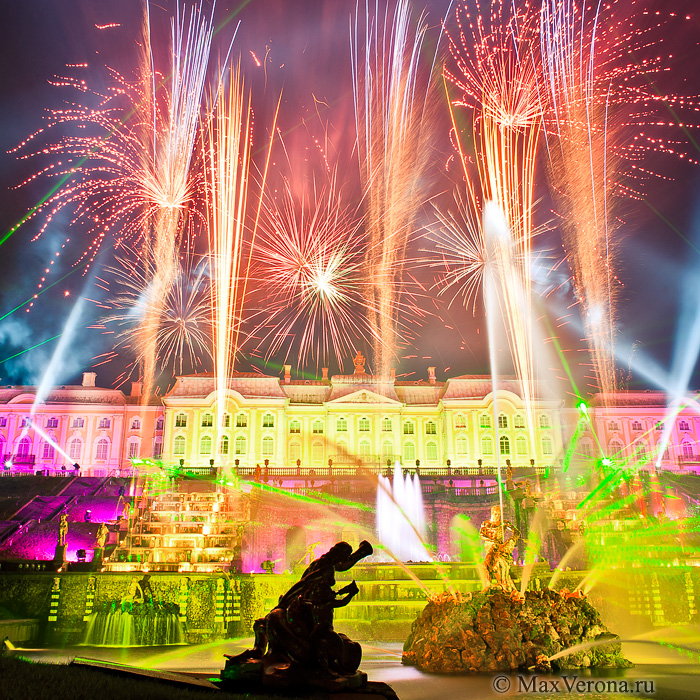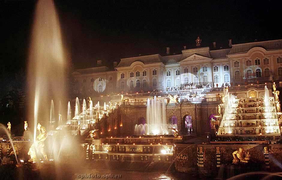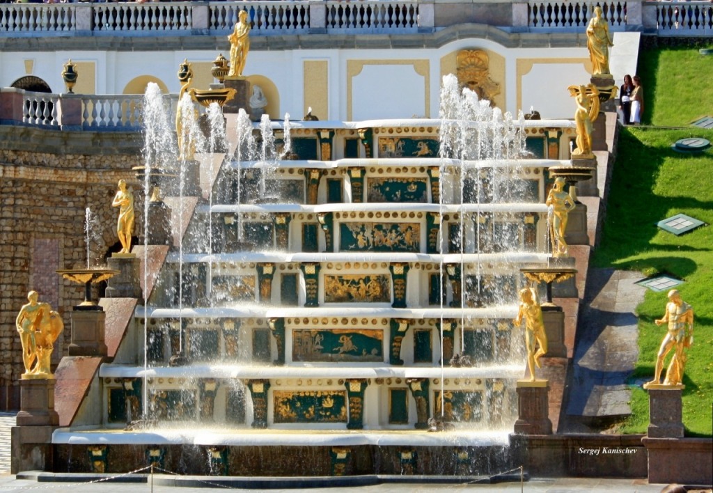 Комплекс Петергофа заложен ПетромI в 1711 году. При его проектировании за основу был взят архитектурный план Версаля. Этот комплекс, конечно, меньше Версаля и состоит из Нижнего и Верхнего парков. Их площадь соответственно равна 102,5 и 15 га. Вместе с тем каскад фонтанов в нем не менее прекрасен. Смотрите: