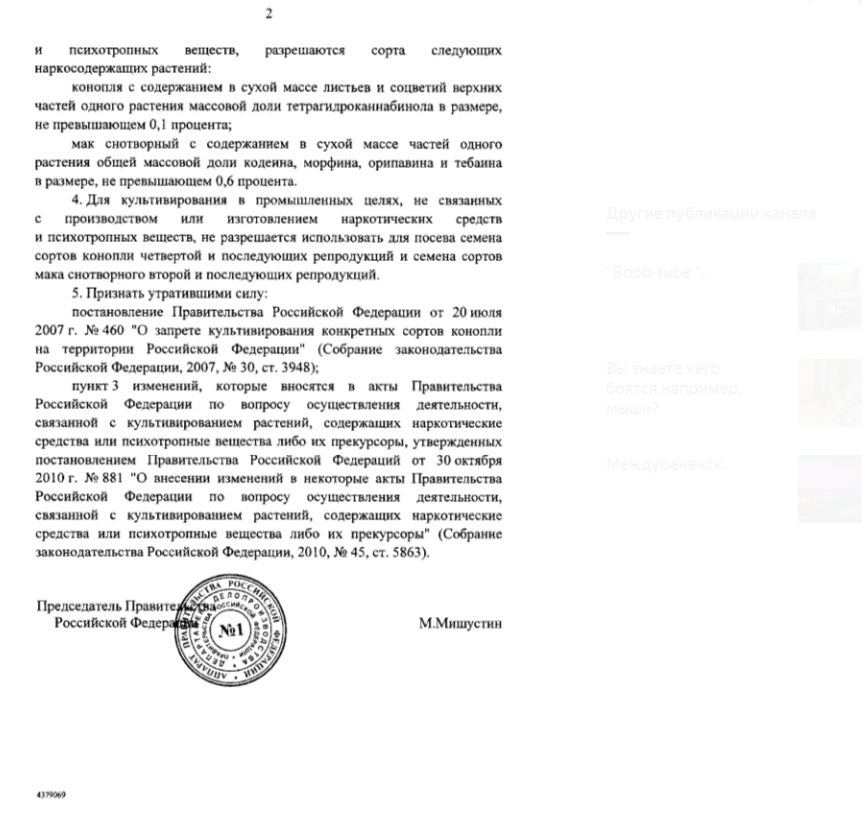 Премьер-министр России Михаил Мишустин подписал постановление о снятии запрета на культивацию наркосодержащих растений — конопли и мака снотворного. Смотрим ниже.