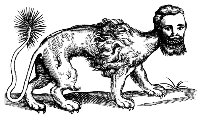 В трудах Аристотеля мантикора - это чудовище ярко-красного цвета, у него лицо человека и хвост скорпиона. Оно большое, как лев и быстрое, как олень. У мантикоры три ряда зубов на каждой челюсти, голубые глаза, она «издаёт шум, напоминающий звук трубы и свирели одновременно», а еще «она дикая и пожирает людей». Такое чудовище может напугать кого угодно.//