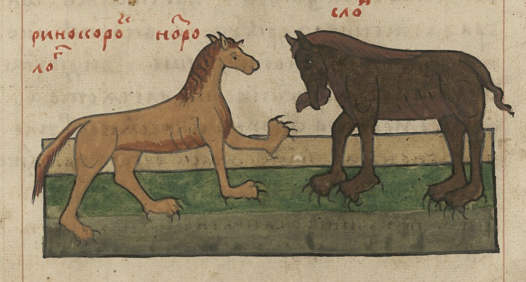 Носорог и слон. Миниатюра «Христианской Топографии», XVIв. Еще одно неукротимое животное, обитающее в теплых странах – носорог, «страшен отнюдь», в русских источниках называемый ноздророг или нариндем. Зверь этот по мощи своей равен слону и нередко враждует с ним. Представления о нем весьма далеки от реальных: согласно описаниям, он имеет рога на губе, а глаза под горлом: «Ноздрог есть зверь приличен слону, страшнее же слона, уши у него медвежии, а очи под горлом, рога на губе, может рогом великое древо искоренити, шерсть что на свинии, ногты и зубы львовы, хвост невелик». Мало напоминают реального носорога и миниатюры с его изображением. Зверя часто наделяют звериными лапами с длинными когтями, гривой и несколькими рогами. Уже на закате Средневековья мы встречаем изображение носорога, весьма похожего на настоящего, однако объяснить это можно не улучшением представлений о природе, а появлением на Руси известной гравюры Дюррера с изображением ринокероса-носорога.