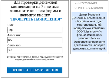 Странно, написано что-"Центр Возврата Денежных Компенсаций - обособленный отдел многопрофильной юридической компании ООО "Мегаполис" с филиалами во всех регионах России. Основное направление деятельности - возврат денежных компенсаций". Но причем здесь украинский домен? Ну хорошо, предположим, что центр этот работает по всей территории снг и по России в частности.