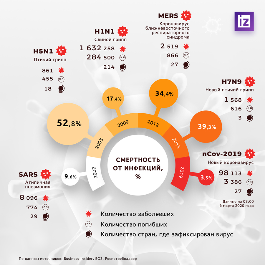 Симптомы заболеваний похожи, но процент тяжелых случаев при коронавирусе выше — в 15% болезнь протекает тяжело, в 5% очень тяжело, смертность достигает 3–4%, пишут «Известия».