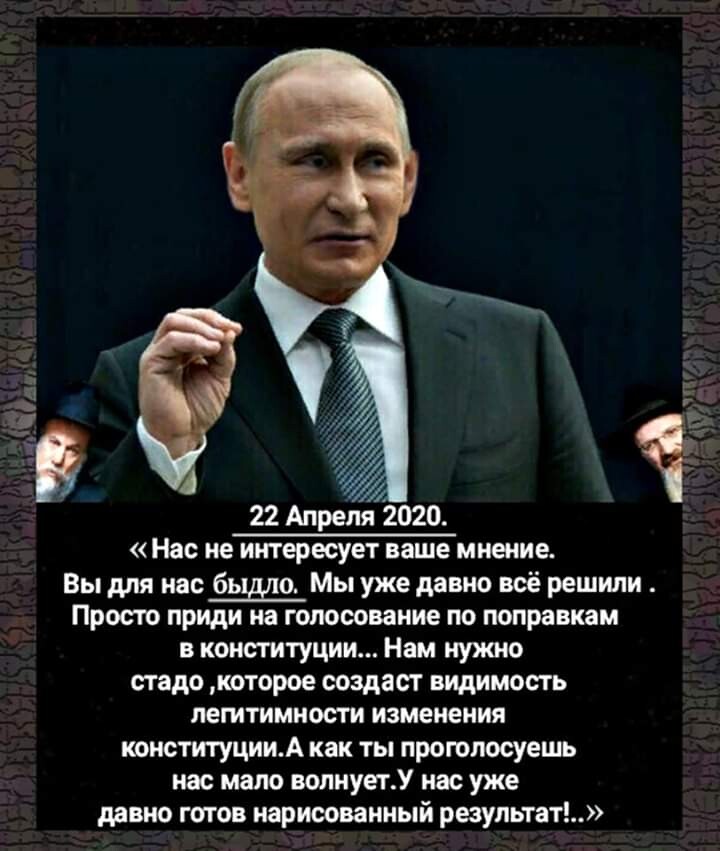 Вроде, народ русский умный народ и это общепризнано, но слышать о ВВП плохое мне неприятно. Понятно, если грязь льют никулины, коневы,"кандидаты" в президенты с низкой социальной ответственностью и иже с ними. Это - пятая колонна или соросята, они за это серебренники получают. Вспомните, как вы жили в девяностые и почувствуйте разницу. Даже Трамп это понимает, не говорю про Эрдогана, а ведь война была ближе, чем в годы карибского кризиса. Вы гляньте на "просвещённый" мир: там у Трюдо жена заразилась, у англичан-министр здравохранения и список можно продолжать, а в России пока нормулёк,так где здравоохранение лучше? Вы заметили, что градус русофобии заметно снизился? Толи ещё будет и Путин об этом сказал конкретно в своих 20 ответах. Последнее: кто накопил " подушку безопасности" для России лет на 10 вперёд? Не предатель Горбачёв,не неадекват Ельцин - Путин В.В! И я пойду 22.04 и думаю более 90% россиян сделают также и выразят своё уважение этому человеку. Ну а вы как хотите, можете даже ехать в Пиндосию и получать американское граждансво, кстати, президент этого не запрещает.