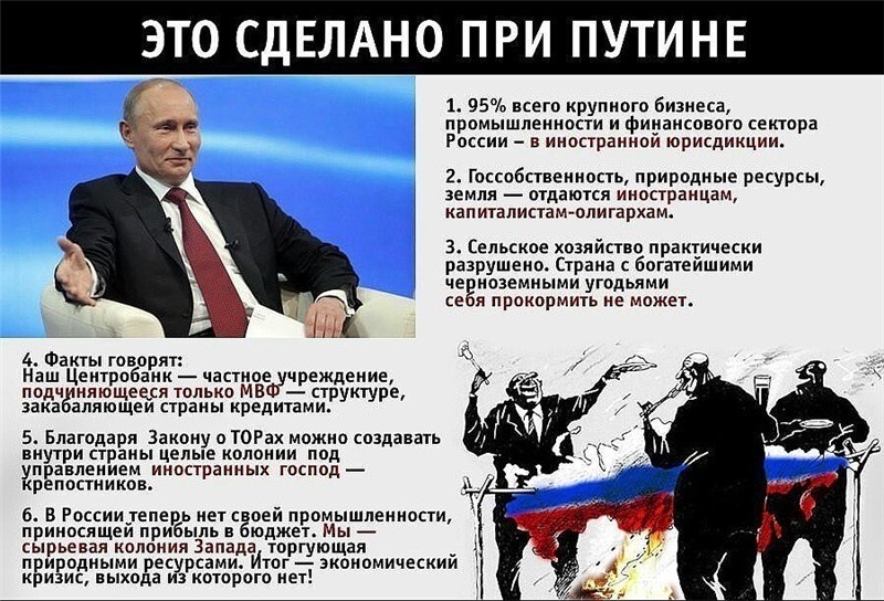А вы хоть в курсе какие были долги и у России, как правоприемника СССР И МЫ ВСЕМ И ВСЕ ОПЛАТИЛИ? И что он лично внес поправку сейчас в КОНСТИТУЦИЮ о национализации богатств "олигархов"?И депутаты-отклонили? Думайте, решайте! В любом районе нашего жития есть проблемы, но есть и много плюсов при его правлении введенных, надо больше вникать... Вплоть до социальных пенсий \теперь помогают больше инвалидам и детства в тч\ и дальневосточникам и северянам социальные билеты авиа и т д А сколько он служащим Армии помог и простым армейским служащим? ВСЕ ПОЛУЧИЛИ КВАРТИРЫ ЛИБО ДЕНЬГИ НА КВАРТИРЫ, даже ничего незначимые кадры по должности! И они молчат, а я в свое время тоже несправедливостью, как их балует, озабочена была-может нам просто не угодишь, когда благо не лично нам? ГРАБЕЖ основной прошел в 90-е и выравниться еще сложно...