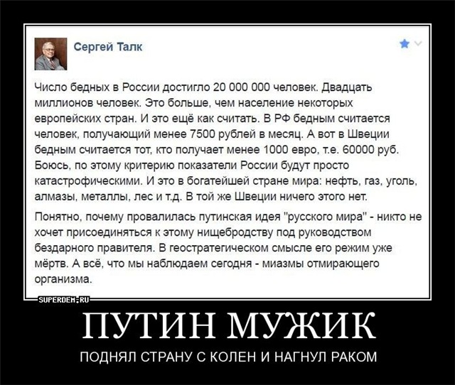 Светлана, я понимаю Ваше раздражение сегодняшними проблемами. За 50 лет работы в капитальном строительстве и органах власти региона СПб и Ленобласти, мой муж детально знает положение дел в стране. Вы НАГЛО ЛЖЕТЕ с чужих слов о состоянии экономики. В стране не просто строится МНОГО новых предприятий, но еще и в новых технологиях на основе НАШИХ ПРИРОДНЫХ РЕСУРСОВ, которых нет и не будет ни у кого в мире! Никто, кроме Путина и его команды, не сделал так много для ликвидации повального воровства при Советской власти! Я помню поговорку на заводах: "Ты здесь хозяин, а не гость, тащи с завода каждый гвоздь!". Вы в какой стране жили? И только настойчивой работой с заменой новыми Лидерами России и можно от этого избавиться, а не "экспроприацией народом" с неминуемой гражданской войной и ГУЛАГом. Да, медленно, но эффективно заставить ВСЕХ воров вернуть награбленное стране в форме инвестиций в НАШУ экономику. Где бы они не прятались с награбленным. И эта практика уже дала результат, который не афишируют по известным приччинам (чтобы не позорить воров). Здоровья Вам и Вашим близким!