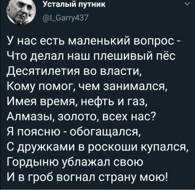 Вот поэтому в стране бардак,одни за него ,а остальные против.Нет единого мнения поэтому и нет порядка.Что построили нового за эти 20 лет пока он у власти.Все совхозы ,предприятия и заводы ,школы,здравоохранение пришло в упадок.Почти все села ушли в небытие. Ковид показал нам истинное лицо ,что у нас есть на самом деле.Села разрушены на 99 %,нет школ ,нет фельшерских пунктов.Взятки да выросли.Если раньше брали миллионеров,то теперь только миллиардеры.А народ нищает.Подняли срок для пенсионеров,мы теперь выживаем,но не живем.Цены никогда в стране так не росли как сейчас.Зачем нам нужны депутаты в Думе,какая от них польза.Они сейчас понапринимали столько Законов себе в защиту,что простому человек пукнуть нельзя,сразу же посадят.И статью найдут и причину.Мы лишены права голоса.А выборы это просто насмехательство над народом,раньше был праздник ,люди шли на выборы с удовольствием и радостью ,а теперь отбили все руки.Хоть ходи голосовать ,хоть не ходи результат один ЕР впереди планеты всей.Власть должна быть сменяемой.Как в других странах.Власть должна быть народной и работать на благо народа,а не для кучки олигархов.Одни не знают куда девать деньги ,а другие горбатятся за гроши.Простой народ очень обижен.Ситуацию надо исправлять.Пенсии должны соотвествовать уровню жизни.Надо чтобы мы жили а не доживали свой век.