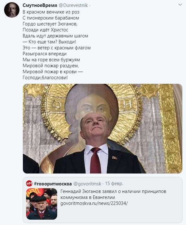 А вы бы хотели, наверное, чтобы компартия ощетинилась копьями против нынешнего правительства и подняла новое восстание? Зачем Зюганову отказываться от правительственной награды, если она заслуженная? Противопоставить себя правительству? Он сам - член правительства. Мы в нашей стране должны терпимо относиться друг к другу и сообща выстраивать общую линию развития государства. И то, что эта линия развития должна быть социалистической, а не капиталистической, у большинства сомнений не вызывает. А те в правительстве, кто придерживается иной точки зрения, пусть уходят. Коммунисты - не карманная оппозиция, как пытаются нас всех убедить официальные телеканалы, в списке которых вы нигде не найдете телеканала КПРФ. Кому интересны реальные дела нынешних коммунистов - смотрите телеканал "Красная линия" https://www.rline.tv/