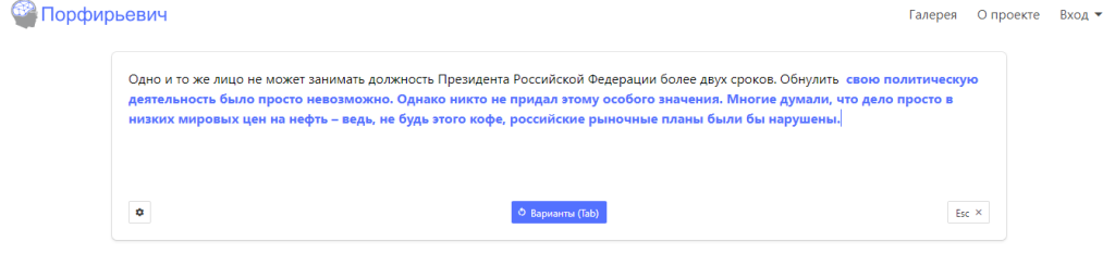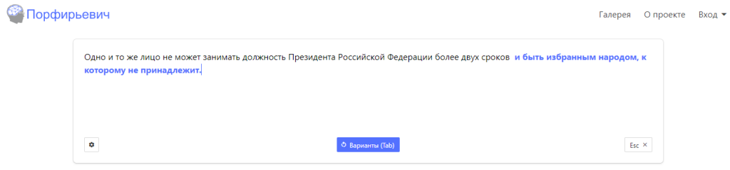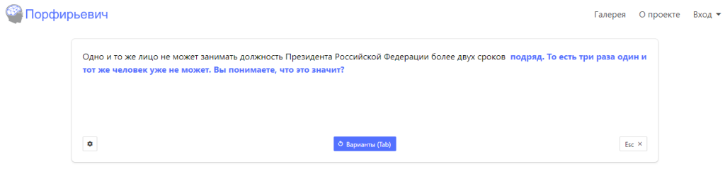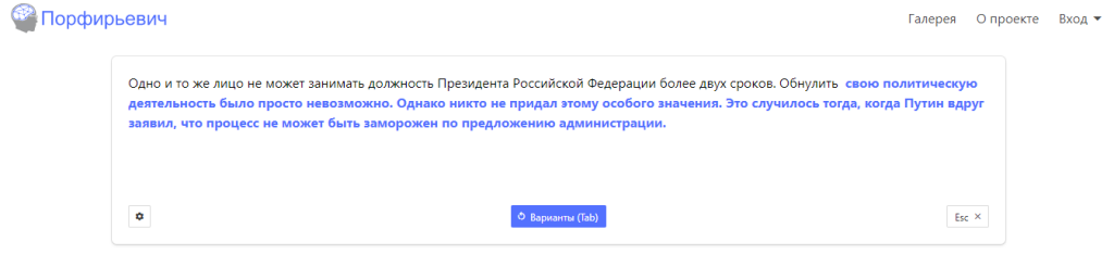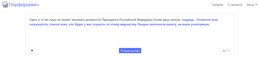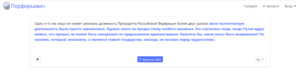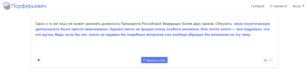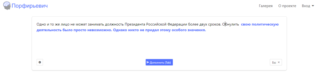Вполне вероятно, что при таинстве творения некоторые из них воспользовались нейросетью «Порфирьевич» (разработчик Михаил Гранкин), которая дописывает тексты на русском языке. Достаточно лишь начать предложение и нажать кнопку «Дополнить», если полученный результат не устраивает, можно подобрать другой вариант.
