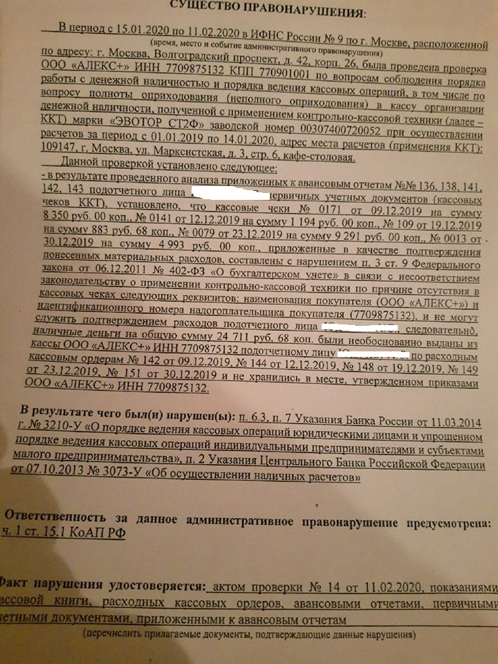 Бухгалтер одного из московских кафе рассказала о том, что налоговики выписали штраф за отсутствие обязательных реквизитов в кассовых чеках — в приложенных к авансовым отчетам документах, не были указаны ИНН и название её организации. Её коллеги начали гадать, за что же организацию могли оштрафовать и при какой проверке. Версий было много, но основная — нарушение порядка ведения кассовых операций по статье 15.1 КоАП. Коллеги с нетерпением ждали подробностей все выходные дни.