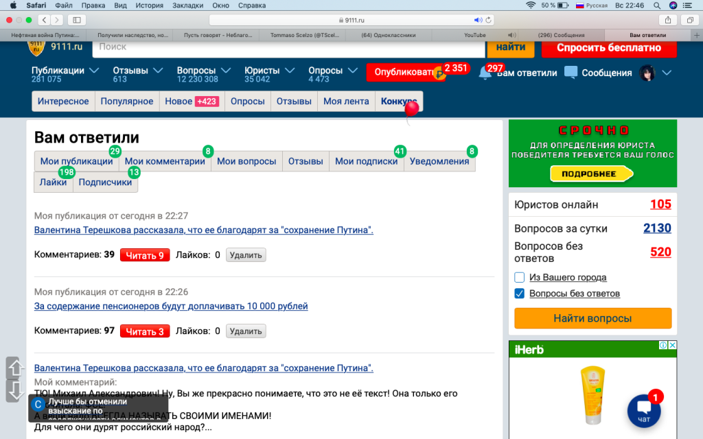 Зашла на сайт, колокольчик показывал 10078, выхожу, колокольчик отзванивает 10062, куда исчезли остальные? Пробыла минут 10.