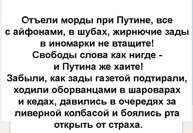 Хватит мозги полоскать Живем мы все на советском что построили коммунисты а Путин все продал у нас ничего своего нету даже семян чтоб посеять огурцы и т д.