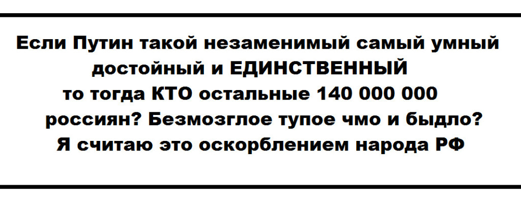Да, действительно, засиделся путин за 20 лет я уверен, мы,русский народ, жили бы куда лучше,100 процентов, возьмем простой пример, человек пришел в магазин и начал выбирать товар, и в окончании он купит хороший товар, с которым он потом будет жить, так а почему не можем выбирать, будущего президента но надо делать это постоянно.