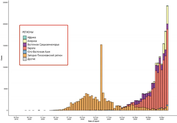 Как видим из графика ежедневно идет прирост выявленных с коронавирусом. Самый большой прирост зафиксирован в Европе и Америке.