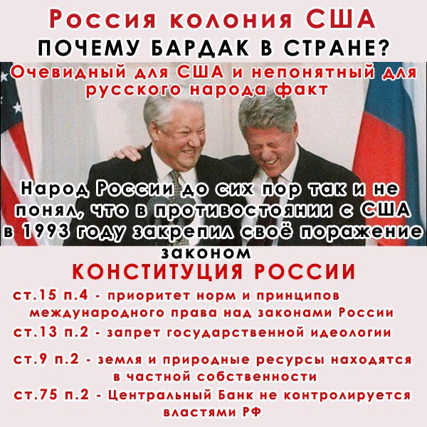 Что ж вы в 1993 г отдали страну через конституцию которую писали Американцы и не возмущались а сечас когда активная часть насиления больше 2 миллионов человек изьявила желания выйти из Американской окупации передали подпеси в органы власти и призидент обьявил ореферендуме вы возмущаетесь? Что хотите оставаться рабами бичами чмошниками?
