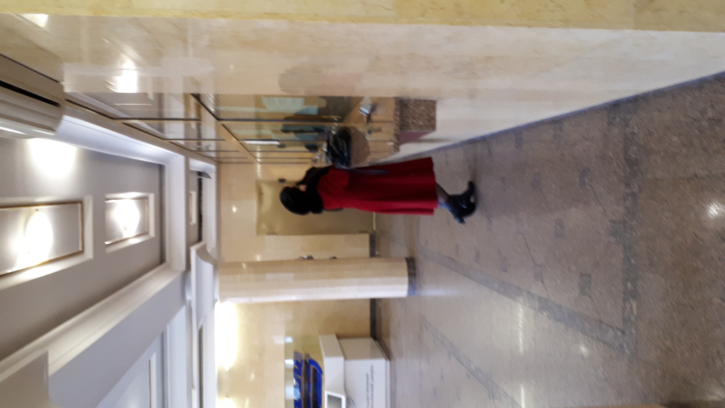 Через соседнее окошко делала возврат дама в красной шляпке и пальто.