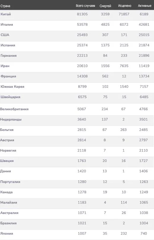 Так, как ВОЗ запаздывает с публикацией свежих данных, мы решили публиковать таблицу по странам на основе открытых источников.