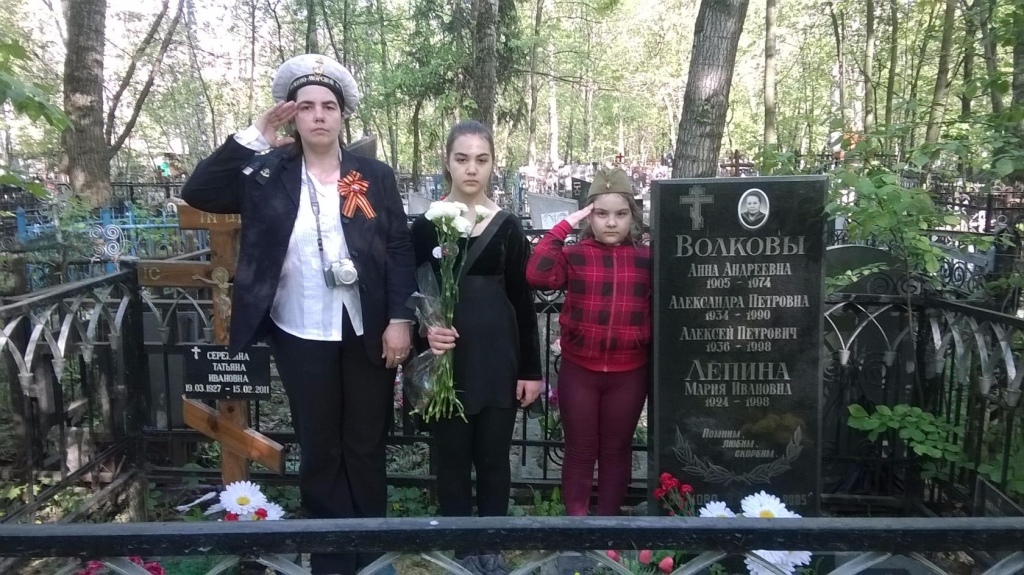 Мой дед, Волков Петр Дмитриевич, был особистом. Призвали в первые дни войны. 5 детей, да еще беременная жена. Погиб на 10-й день войны. Похоронен в Москве, на Крестовско кладбище. Могила не сохранилась. Но 9 мая мы навещаем его. Цветы кладем, как посоветовал священник, на любую безымянную могилу. Бабушка, Волкова Анна Андрияновна, 1905 г. рождения, Рязанская область, его жена, с шестью детьми на руках, взяла под опеку еще троих соседских детей, у которых родители погибли. Работала и на кухне солдатской посудомойкой, мыла полы, стирала солдатам, работала в котельной. Малышка, к сожалению, умерла. Но всех остальных бабуля воспитала, дала образование, выдала замуж, женила. Мы все, независимо от происхождения, считались одной семьей. Разве она не героиня Отечественной войны? На фото: 1. Бабушка с дедушкой; 2. Дед - младенец с родителями в Питере; 3. Бабуля с детьми и внуками (я в платье); 4. Чтем память наших героев. Моя дочь с внучками. Так уж случилось, что я теперь старшая в роду.