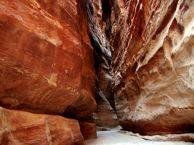 Ущелье Сик С первых шагов по ущелью туристы начинают удивляться: это узкий каньон длиной примерно 1 км. Из древних записей понятно, что каньон извилистый, потому что напоминает посох Моисея — это скажет каждый местный араб. Ширина меняется на протяжении всего пути, в некоторых местах очень узкие проходы, и конные повозки еле-еле могут протиснуться. Встречаются и широкие участки. Здесь интересно смотреть на склоны, вид которых меняется на закате и рассвете. Это самое лучшее время, когда удаётся лицезреть поразительные монолиты, но даже днём они смотрятся здорово.