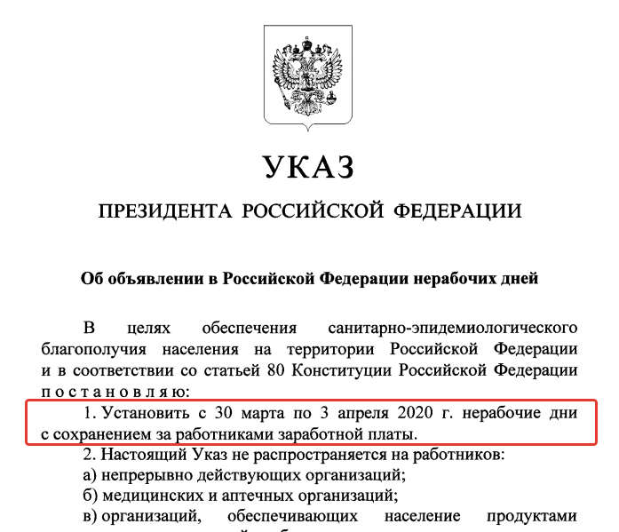 См.: Указ Президента РФ от 25 марта 2020 г. "Об объявлении в Российской Федерации нерабочих дней".
