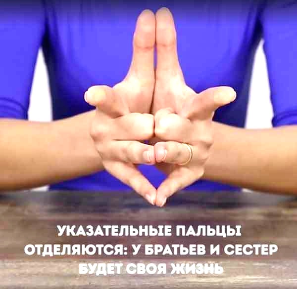 Если Вы сомкнете указательные пальцы вниз (также, как средние на фото), а остальные вверх, то средние пальцы разомкнуть будет также трудно, как и безымянные в описываемом статьей случае. Сжатые вниз пальцы натягивают мышцы следующих за ними пальцев и только поэтому их трудно разомкнуть.