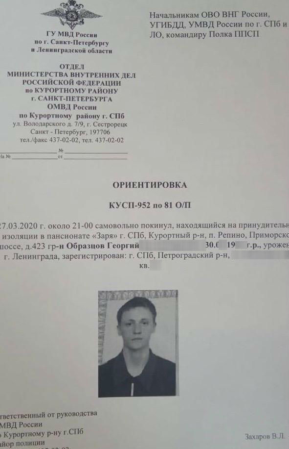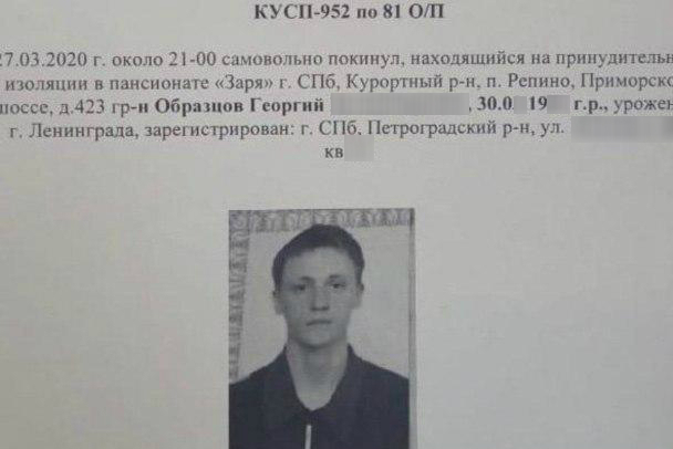 Полиция ищет 32-летнего петербуржца Георгия Образцова. Полиция рассылает ориентировки. Около девяти вечера 27 марта он сбежал из пансионата “Заря” в Репино - вылез в окно. Туда его принудительно поместили, как несогласного с самоизоляцией после прилёта из-за границы. По данным, в минувшую субботу Георгий прилетел из Швейцарии, добирался через Москву. Вместе с ним была и его 62-летняя мать. Установлено, что из Пулково до дома родственники добирались на своей машине, оставленной на парковке аэропорта.