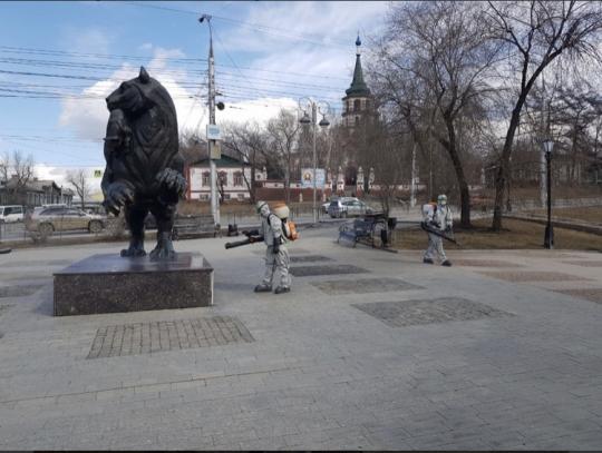 Иркутск. Дезинфекция скверов, парков, остановок из-за короновируса.