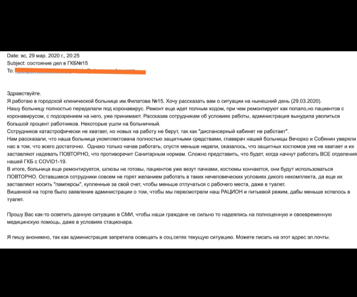 Вот такое письмо пришло на электронную почту от одного из врачей больницы им. Филатова № 15 в Москве.