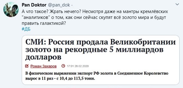Не понял. И что? Россия продала золото Великобритании. Аж целую тонну, с ума сойти...:):) В чем проблема? Россия ВСЕГДА продавала золото. Во времена Сталина, СССР сотнями тонн золото продавал. Вы не хотите повозмущаться по этому поводу? И при Хрущеве, Брежневе, Андропове, Горбачеве, Ельцине-тоже. Что вашу чувствительную душу так ранило?