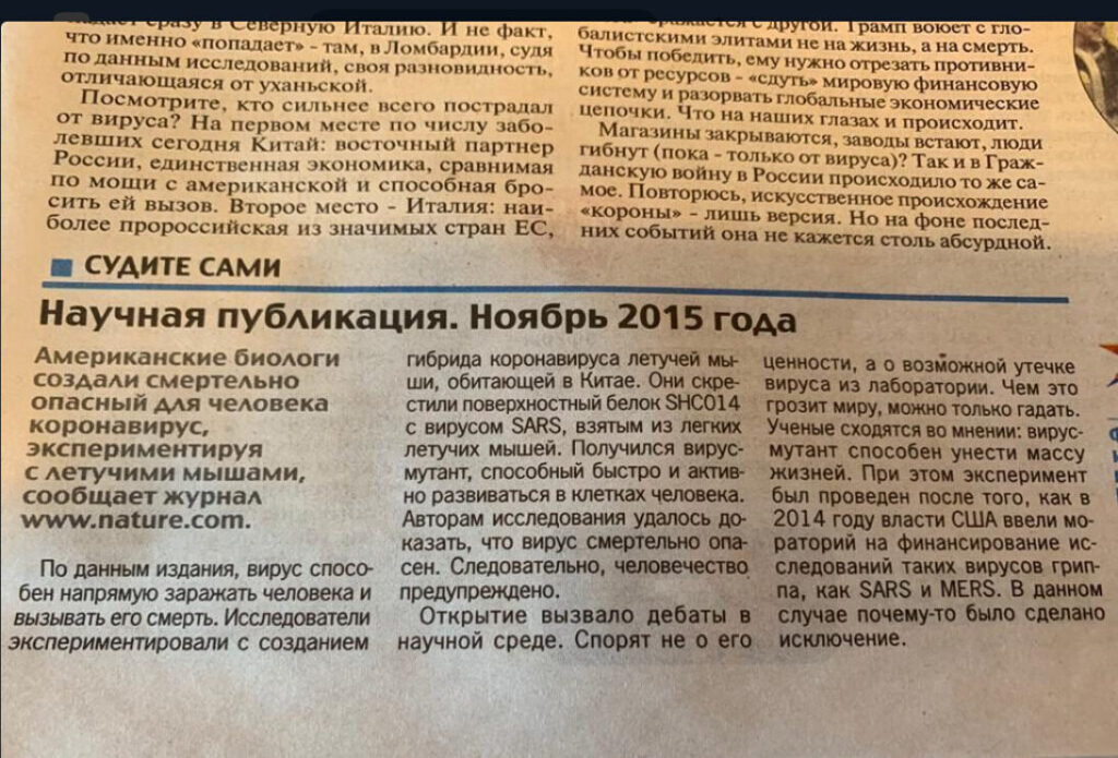 Не понятно только, если, как утверждают, вирус искуственно изобретён в 2015 году, то почему утечка в декабре 2019 произошла? И именно продавщица креветок на рынке стала проводником?... И потом эту статью в газете все уже видели и ни раз, но главы государств не винят США?