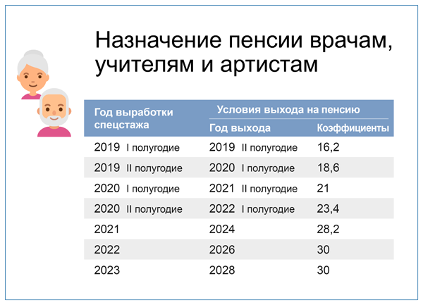 Вместе с тем начиная с 2019 года выход на пенсию работников перечисленных профессий определяется с учетом переходного периода по повышению пенсионного возраста. В соответствии с ним назначение пенсии врачам, учителям и артистам постепенно переносится с момента выработки специального стажа. При этом они могут продолжать трудовую деятельность после приобретения необходимой выслуги лет либо прекратить работу.