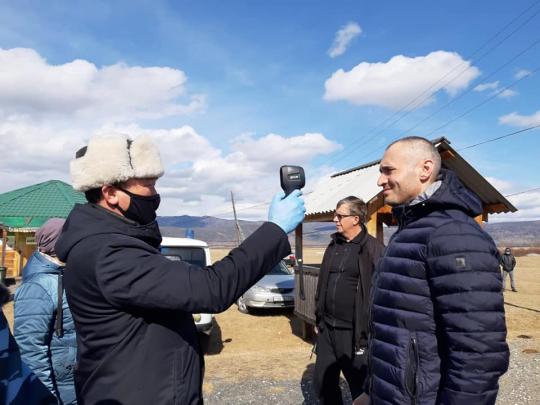 Пост начинает работу и сразу возникают два вопроса – где термометр и как писать на морозе шариковой ручкой, когда возможный носитель инфекции стоит, сволочь, прямо напротив тебя без маски и в лицо тебе дышит? Надо исправлять ситуацию, и из райцентра приезжает сам Иван Альхеев, его замы, главврач районной больницы и, самое главное, иркутские телевизионщики, как бы случайно оказавшиеся рядом чтобы заснять всю эту лихую вакханалию справедливости. Орфографическую ошибку на баннере спешно исправляют. Глава района лично меряет температуру проезжающим, дает интервью.