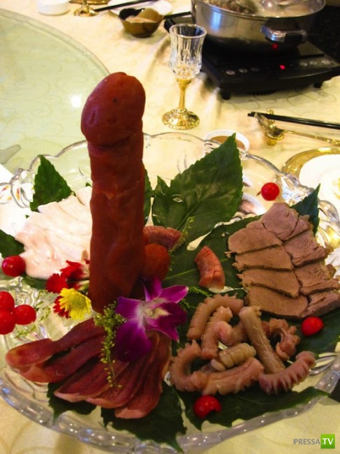 Посещение ресторана не подходит для слабонервных и чувствительных натур. Почти все блюда сохраняют первозданный вид гениталий, хотя большинство из них и носит красивые названия: «Сущность Золотого Будды», «Взлет Феникса», «Цветы жасмина, выложенные в 1000 слоев». Некоторые блюда подаются в сыром виде. (опять сырое мясо!)