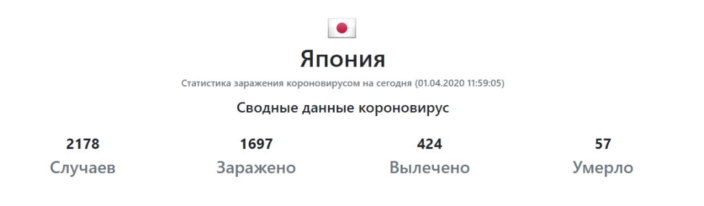 Напоминаю вам, что первый зарегистрированный случай заболевания в Японии случился 16 января 2020 года, и за прошедшее время общее количество больных увеличилось не значительно, а на сегодня, 01 апреля 2020 года , составило: