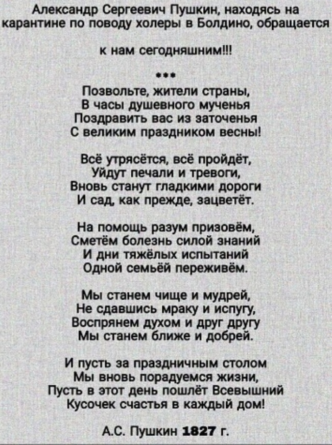 «Позвольте, жители страны,»… Замечательное стихотворение, соответствующее нынешнему времени, которое молниеносно разлетелось по всему интернету, а также по радио и телевидению. Поверили в то, что стих принадлежит действительно Пушкину, абсолютно все! Но писал ли на самом деле наш любимый Александр Сергеевич эти строки? Корреспондент «Комсомольской правды» провел самостоятельное расследование и нашел настоящего автора. Это казахский сетевой поэт под псевдонимом Урри Грим, который 21 марта 2020 года опубликовал это стихотворение на «Фэйсбуке». Под стихотворением не было ни подписи «А.С. Пушкин», ни даты «1827 г.». Стих разлетелся по сети, но кому-то вздумалось для большей популярности дописать под текстом еще и дату с подписью «А.С.Пушкин». Так, в условиях пандемии, обнадеживающее стихотворение «Позвольте жители страны…» стало поистине популярным. Урри же сочинил ответное стихотворение на чью-то мистификацию. «Какой такой, простите, Пушкин?...»