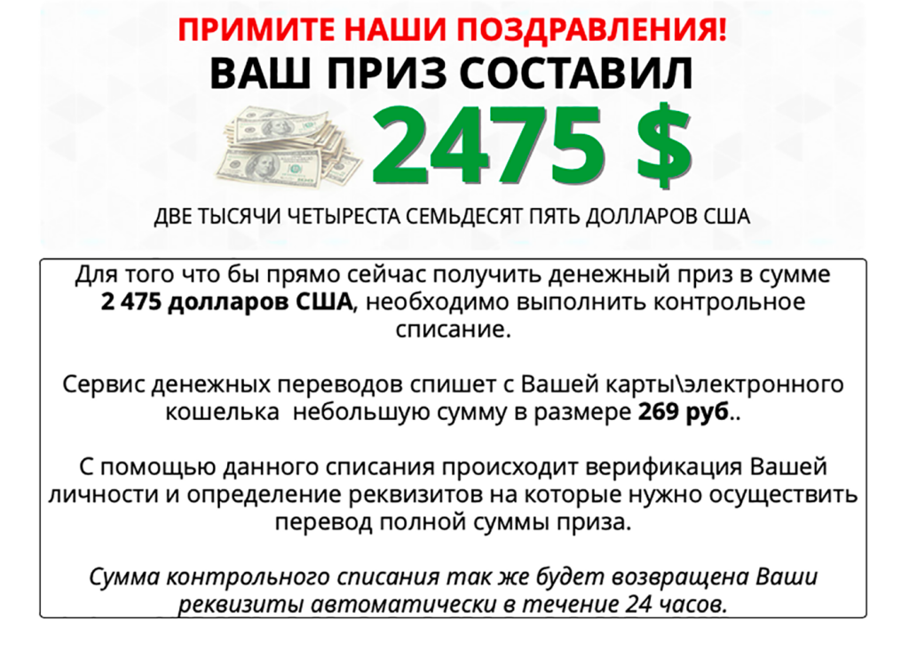 За четыре клика удалось «выиграть» 2475 $, но после контрольного списания 269 Р счет так и не пополнится