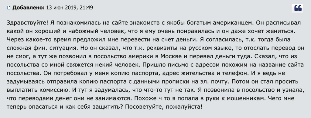 Одна женщина решила найти свою судьбу на международном сайте знакомств. Параллельно она общалась с другими одинокими девушками на русских форумах: там женщина узнала, к каким уловкам прибегают мошенники.