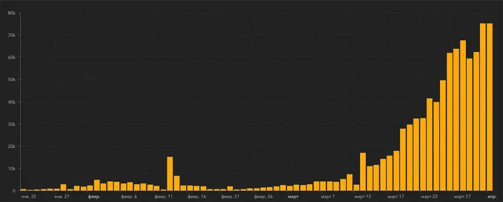 Подбираемся к 1 миллиону - ситуация в мире продолжает оставаться сложной. На сегодняшний день в мире выявлено 938 373 случаев. На графике ниже видно, что уровень выявления уже двое суток находится на уровне 75 тысяч случаев в сутки.