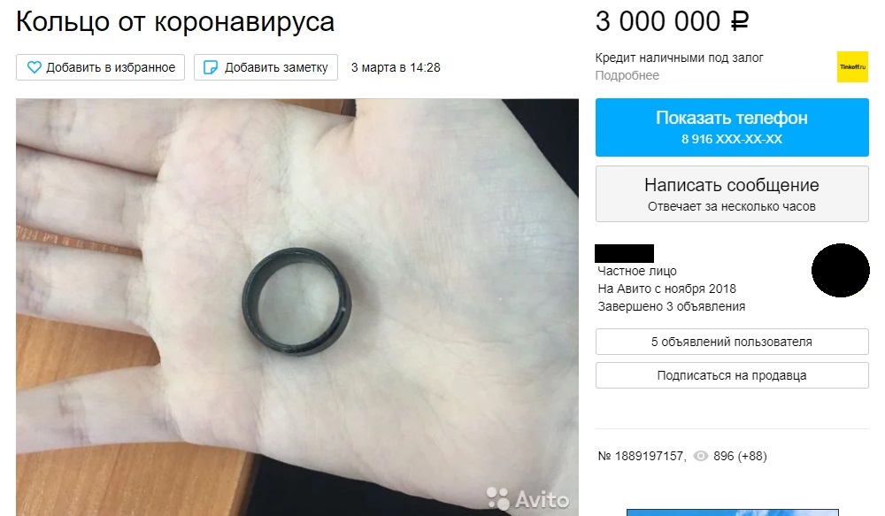 В завершение – явно шуточное объявление. Девушка предлагает приобрести кольцо, которое по ее заявлению краснеет, если его обладатель приблизится к зараженному вирусом. Цена вопроса – всего 3 000 000 рублей. Вдохновлялась ли дама при составлении объявления произведениями Толкина или Сапковского – неизвестно. На этом моменте переходим к более серьезной проблеме.