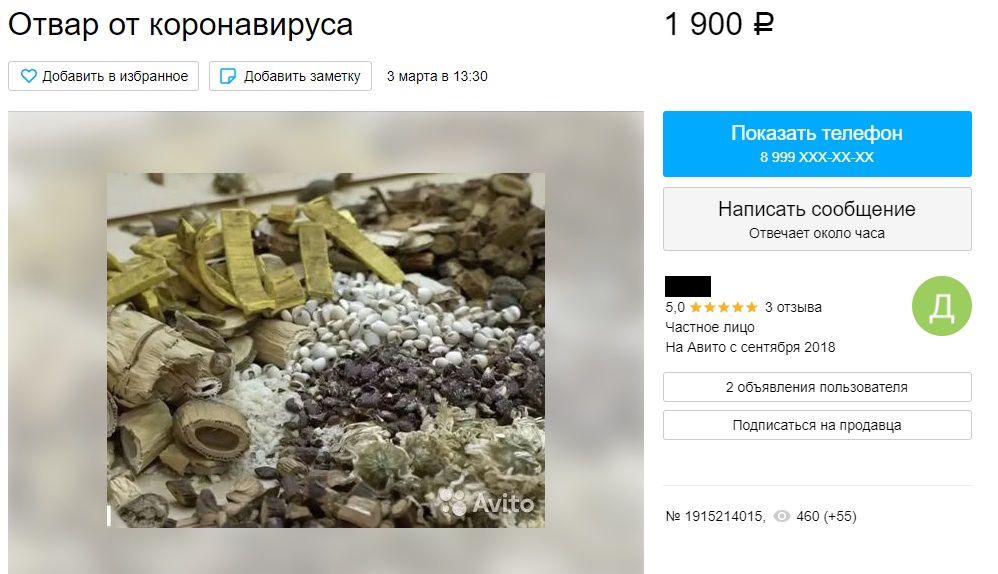 100 грамм отвара «от коронавируса» обойдется в 1900 рублей. Судя по числу просмотров объявления, покупатели на данный товар находятся.