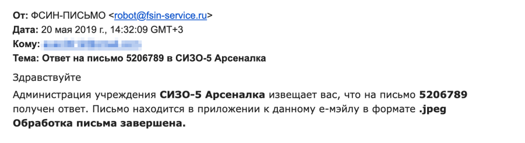 Так выглядит уведомление, что на электронное письмо пришел ответ от заключенного