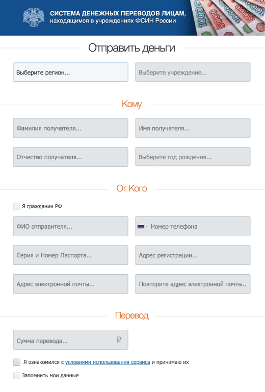 Чтобы отправить деньги, нужно выбрать исправительное учреждение и заполнить информацию об отправителе и получателе платежа. Сумма поступает на счет в течение трех рабочих дней. Информация о зачислении денежных средств приходит на электронную почту отправителя — ее нужно указать при переводе.
