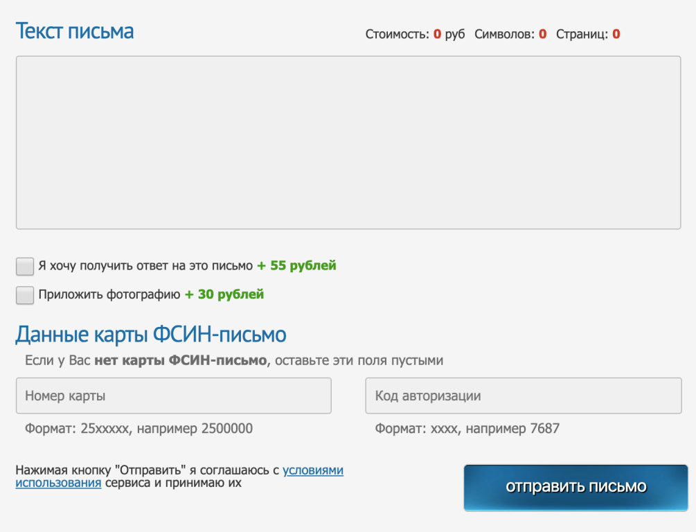 Текст письма также набирается в форме на сайте. Одно письмо стоит 55 Р, столько же нужно заплатить за ответ