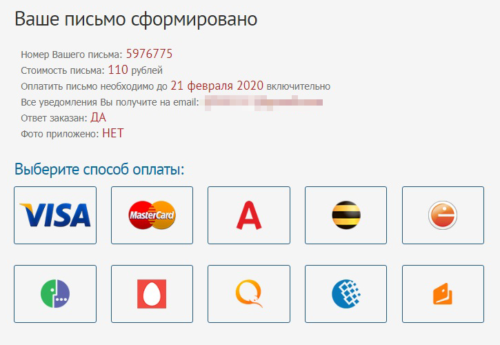Оплатить письмо можно по-разному: банковской картой, со счета мобильного телефона, при помощи электронного кошелька, через систему Contact.