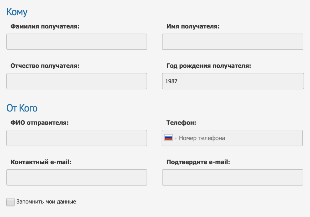 Затем необходимо заполнить личные данные в специальной форме: ФИО и год рождения получателя, ФИО, телефон и электронная почта отправителя