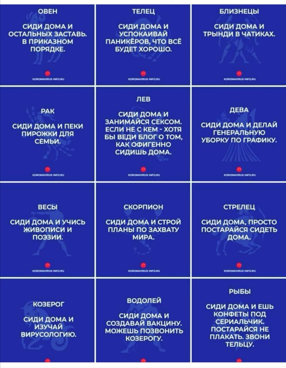 Уважаемая Марина их Костромы, вот есть сейчас в России такой "героический подвиг" - в честь 75-летия Победы в ВОВ военные совершают переход на лыжах по маршруту Хабаровск — Москва, чтобы почтить память героев войны. (а зачем ещё нужны ВС РФ, правда?) и там почти все знаки зодиака херачат. Но они явно не читали Ваши рекомендации и теперь им что, гореть в аду? А ещё есть ВВП, который весы, и он только что прервался на свои "занятия по живописи и поэзии" и в своём выступлении оставил весь народ один-на-один с пандемией, да ещё наложил штраф на всех за попытку выйти из дома за лекарствами или продуктами. Вы ведь его теперь проклянёте?