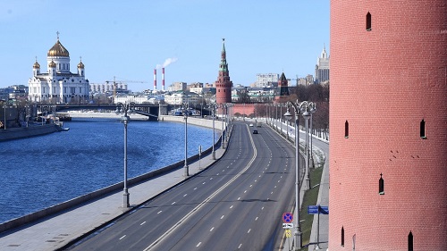 Вид на пустую Кремлевскую набережную с Большого Москворецкого моста в Москве © Sputnik / Илья Питалев.